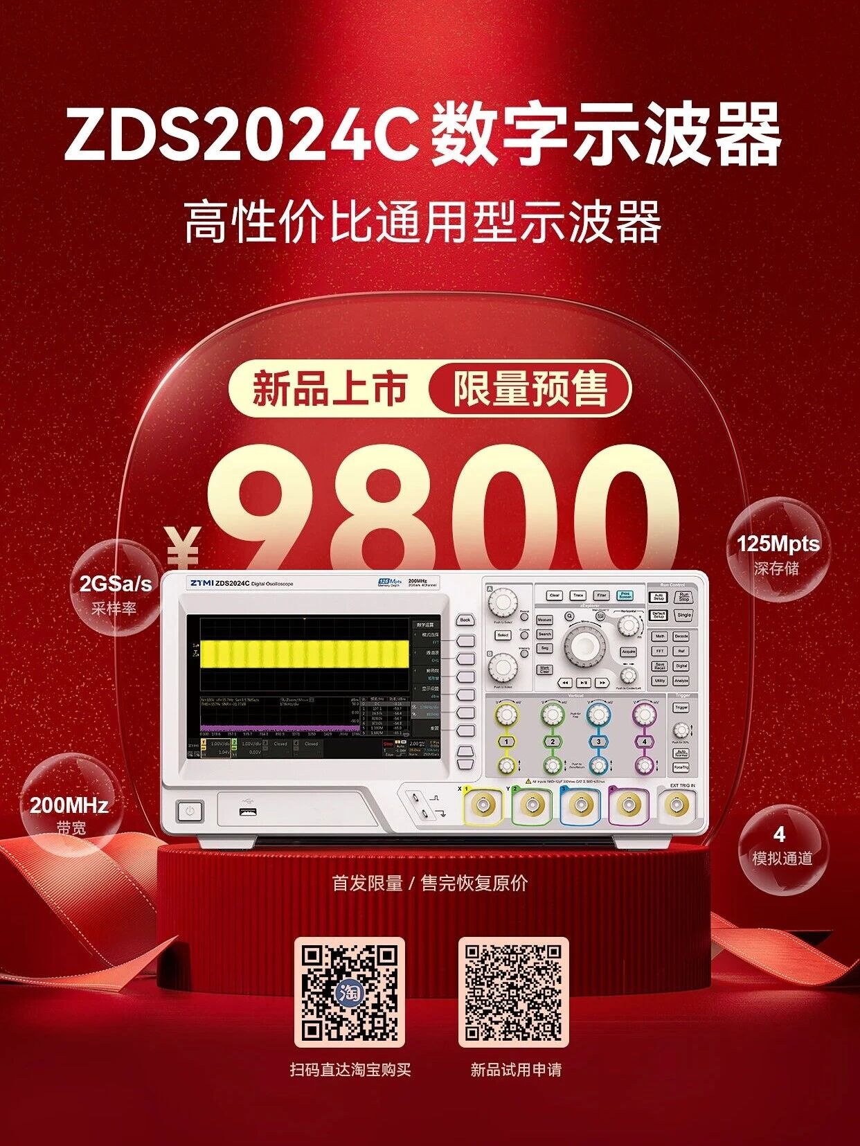 ZDS2024C數字示波器,高性價比通用型示波器。ZDS2024C 新品上市,200MHz帶寬,2GSa/s采樣率,125Mpts存儲深度,標配21種協議解碼,MTA上位機軟件,首發限量預售價9800元